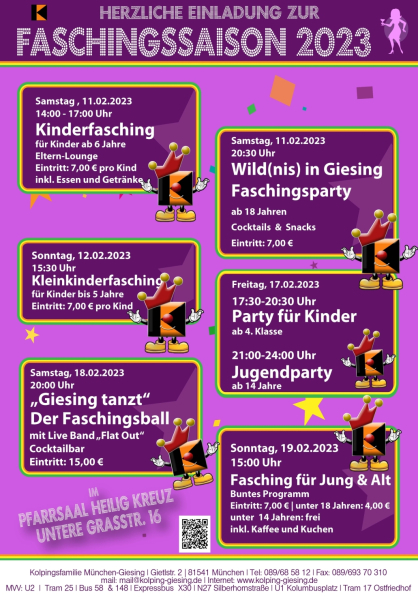 So auch in diesem Jahr. Die Kolpingsfamilie München Giesing eröffnet am 11. Februar die Faschingssaison. Eine ganze Woche lang wird dann kräftig gefeiert- für alle Generationen ist etwas dabei.