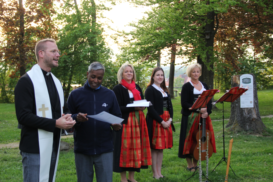 Der extra aus München angereiste Landes- und Diözesanpräses Christoph Wittmann konnte zusammen mit Pater Benjamin bei schönstem Wetter die Maiandacht unter freiem Himmel zelebrieren. Mitglieder der beiden Vereine lasen Texte und Gebete zum Thema „Blühendes Leben - Maria“.
