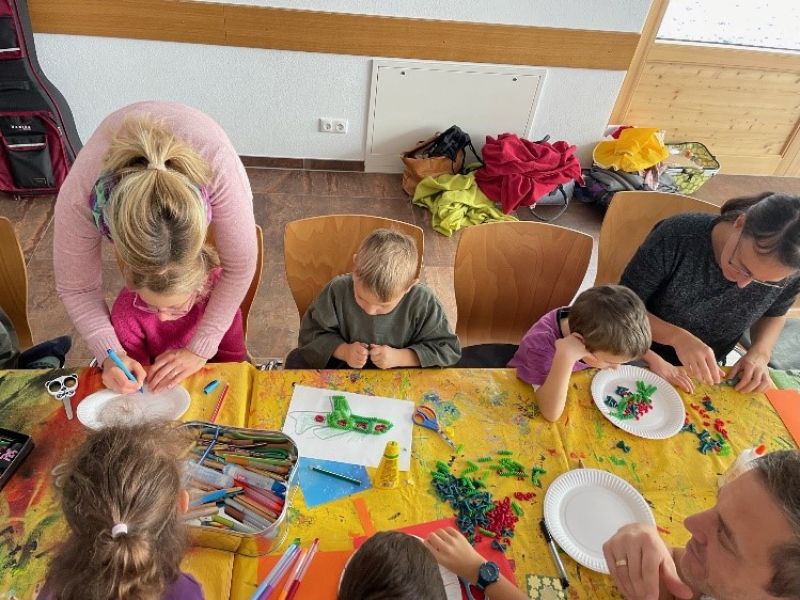 Nach der Mittagspause ist ein Teil mit den Kindern nach draußen gegangen und hat ein Spiel gespielt, während die Eltern in der Erwachseneneinheit Impulse zu Engeln bekommen haben.