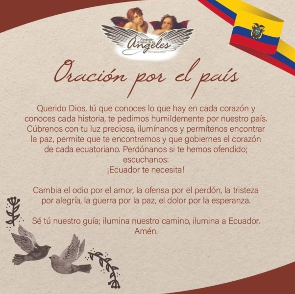 Geliebter Gott, der du weißt, was in jedem Herzen vor sich geht und jede Geschichte kennst, dich bitten wir demütig für unser Land. Erfülle uns mit deinem kostbaren Licht, erleuchte uns und hilf uns den Frieden zu finden, lass uns dir begegnen und führe die Herzen aller Ecuadorianer. Verzeih uns, wenn wir gesündigt haben und erhöre uns: Ecuador braucht dich!