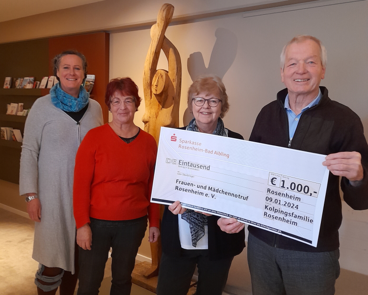 Die Kolpingsfamilie Rosenheim, vertreten durch den Vorsitzenden Eberhard Häfele (rechts) und der Kassiererin Waltraud Reich (Zweite von links), übergaben einen Spendenscheck in Höhe von 1000€ an den Frauen- und Mädchennotruf. Von Gewalt betroffenen Frauen, Kindern und Jugendlichen kann hiermit die notwendige Unterstützung gegeben werden. Den Scheck nahmen die Vorstandsmitglieder Karin Gack (Zweite von rechts) und Christiane Cremer (links) entgegen.
