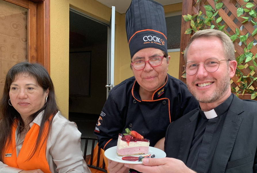 Ein Highlight war für mich das Treffen mit Kolping Ecuador in Quito. Geschäftsführerin Jeanette Calvachi Noboa führte mich durch die Casa Kolping mit Hotel und Kochschule, ich traf Vertreterinnen und Vertreter der Kolpingsfamilie Quito sowie den Nationalvorstand von Kolping Ecuador. Ich bekam einen Einblick in die Projekte und das Jugendprogramm von Kolping Ecuador und wurde reich beschenkt mit einem Poncho, lokalen Köstlichkeiten und einem schmackhaften Mittagessen. Die letzte Nacht vor dem Abflug verbrachten wir als Gruppe im Kolpinghotel, wo wir noch die angenehme Atmosphäre spüren durften – beim Abendessen und dem abendlichen Zusammensein auf der Dachterrasse.