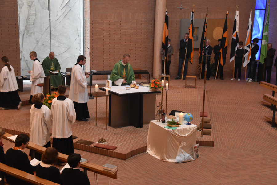 Für die Gabenbereitung nahmen die beiden Zelebranten Christoph Wittmann und Präses Gerhard Beham Symbole entgegen, die die große Bandbreite der Veranstaltungen der Kolpingsfamilie darstellten. Es durfte natürlich ein frisch gebackenes Brot aus dem Waldramer Brotbackofen nicht fehlen. So galt u. a. auch ein Zeitungsbündel für die Altmaterilasammlung, ein Liederheft mit Kranz für unsere Veranstaltungen mit jungen Familien, ein Kreuz mit Kerze für die christlichen Feiern, ein Schalfsack für das Zeltlager der Jugend und ein Globus für die Veranstaltungen mit Geflüchteten. So sollten die Aktivitäten der Kolpingsfamilie mit in die Wandlung am Altar einbezogen werden.