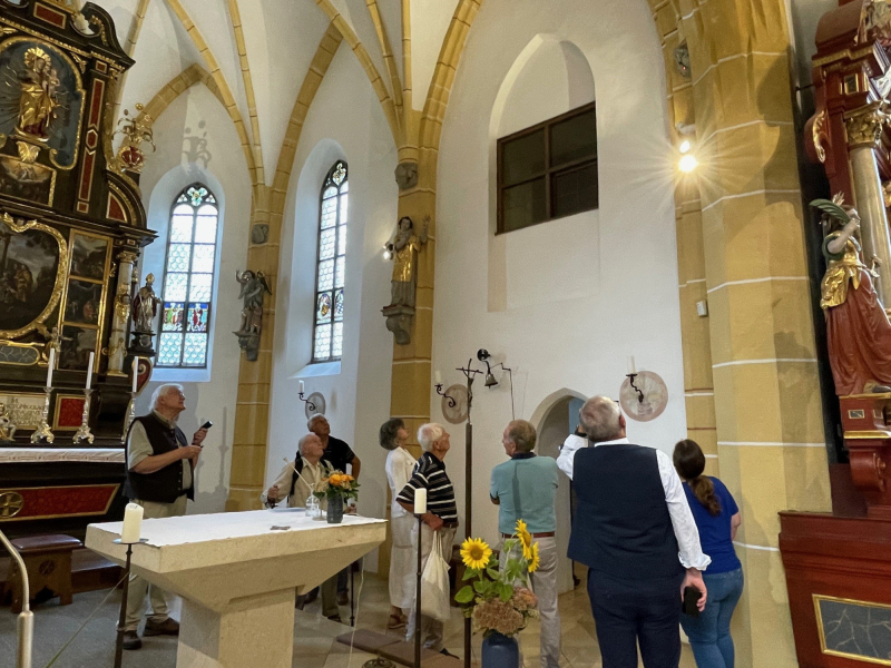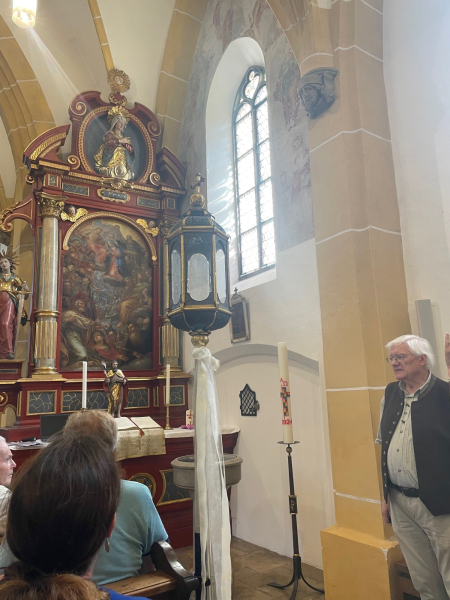 Werner Attenberger, ehemaliger Diözesanvorsitzender und Leiter der Kommission 60+, führte die Gruppe kenntnisreich durch die Kirche. "Unser Pfarrer sagt immer: In dieser Kirche gibt es keinen Stein, den du nicht mit Namen kennst", scherzte Werner Attenberger am Ende der Führung. Als langjähriges Mitglied des Pfarrgemeinderates hatte er seinerzeit die Renovierungsarbeiten eng begleitet.