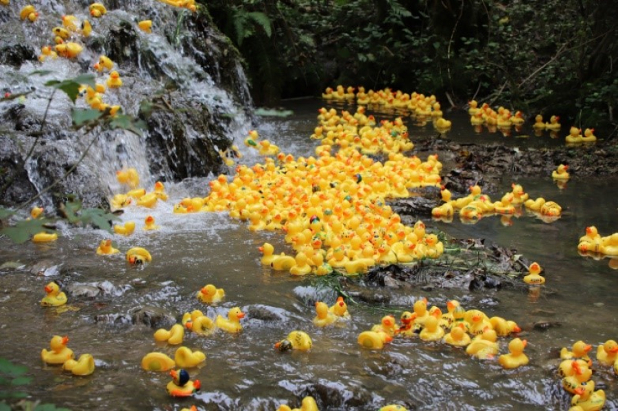 Exakt 1698 gelbe und zum Teil bunt bemalte Enten gingen am vergangenen Wochenende beim 4. Tittmoninger Entenrennen der Kolpingsfamilie Tittmoning an den Start. Bei bestem Sonnenschein herrschten ideale Bedingungen für den Massenstart der beliebten Quietscheentchen im Ponlachbach. Im oberen Ponlachgraben hatten sich bereits vor dem Start viele Zuschauer positioniert, um sich die besten Blicke auf die Rennstrecke zu sichern. Wenn auch die Wassertemperaturen für eine deutliche Erfrischung sorgten, ließ das die kleinen, sportlichen Schwimmer kalt, denn eine Ente aus Gummi ist schließlich zäh und hart im Nehmen.