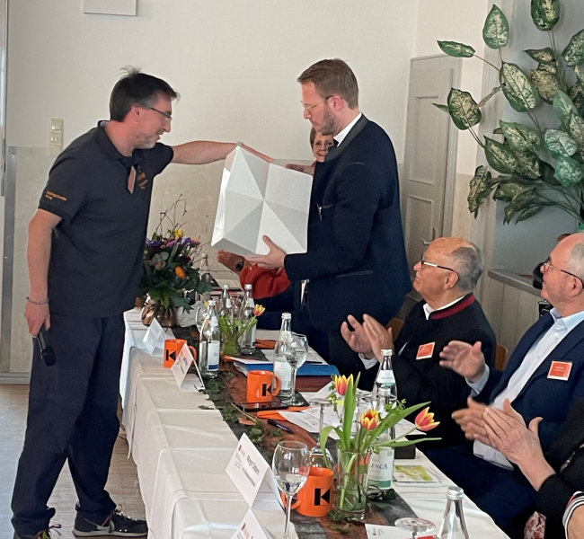 Für eine große Überraschung und große Freude sorgte Thomas Stiegler von der Kolpingsfamilie Poing. Er überreichte Christoph Wittmann, stellvertretend für den Diözesanvorstand, eine Keramikkachel der Kirche Seliger Rupert Mayer in Poing. Der Diözesanvorstand freute sich sehr über dieses Zeichen der Verbundenheit, zumal die Kolpingsfamilie Poing im kommenden Jahr Gastgeberin der Diözesanversammlung sein wird.