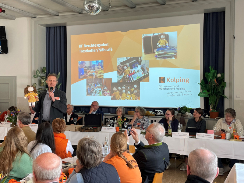Martin Kienast, Pastoralreferent und Mitglied des Leitungsteams der Kolpingsfamilie Berchtesgaden, berichtete vom dortigen Trostkoffer-Projekt. Er erläuterte, wie der Trostkoffer dazu dient, Familien in schwierigen Lebenslagen zu unterstützen, und stellte die Möglichkeit vor, dieses Projekt auch in anderen Kolpingsfamilien zu integrieren.