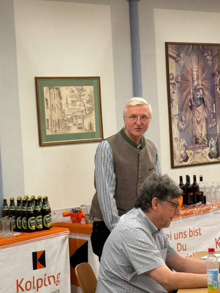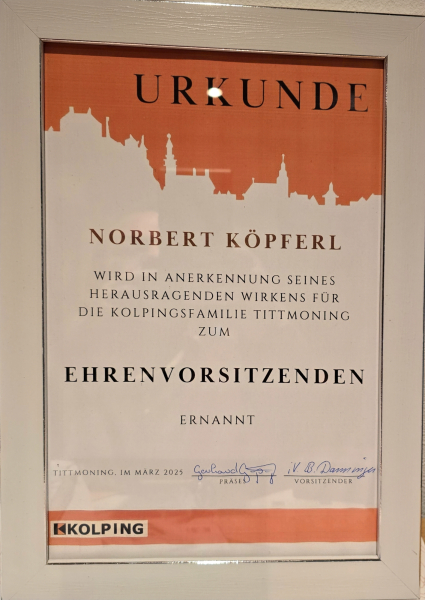 Diesen Worten schloss sich auch Diözesangeschäftsführer Alfred Maier in seinem Grußwort an und wünschte der Kolpingsfamilie Tittmoning weiterhin einen arbeitsfähigen Vorstand. Für die Nachfolge des Ersten Vorsitzenden ermutigte er die Mitglieder, in ein solches Amt hineinzuwachsen: „Wir brauchen keinen zweiten Norbert Köpferl. wer es macht, macht es nach seiner Vorstellung: und das ist gut so“. Mit Bezug auf die politische Situation und den unerwartet schnellen demokratischen Werteverfall, appellierte er an die Mitglieder, dass die Kolpingsfamilie zu ihren Werten stehen müsse. „Die Würde des Menschen ist unantastbar, darüber darf man nicht streiten“, lobte er die Planungen für das Sternenkindergrab in Tittmoning. Mit einem Ausblick auf die Landeswallfahrt am 3. Oktober 2026 lud er die Mitglieder zu diesem Ereignis nach Freising ein.