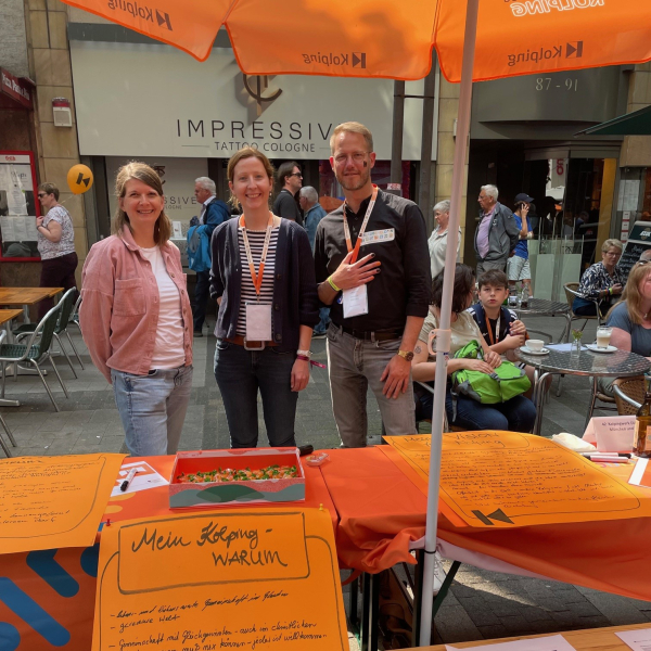 Im Rahmen des großen Jubiläumsfests war auch der Diözesanverband München und Freising beim Orange Table in der Breite Straße in Köln präsent. Mitten in der Innenstadt luden Mitglieder des DV Passantinnen und Passanten zum Gespräch ein – über das, was Kolping heute ausmacht, und über das, was bleiben oder sich verändern sollte.