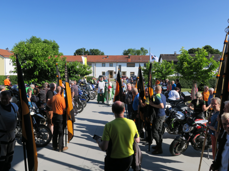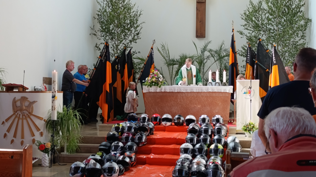 Nach Ankunft am Freitagnachmittag in der Gaststätte Fratello in Töging und dem ergänzenden Eintrag in die vom Diözesanverband vorbereitete Anmeldeliste gab es gegen eine Aufwandsgebühr zunächst Kaffee und Kuchen, orange Kolpingbänder und Ansteckbuttons mit eigens von einem Töginger Kolpinger entwickeltem Design. Die Teilnehmer bezogen nach einem ersten Plausch die in der Umgebung gebuchten Hotelzimmer und konnten geduscht und der Motorradkleidung entledigt in den von den Tögingern organisierten Shuttlebus steigen, der alle wieder zum Veranstaltungsort brachte. Ein kurzweiliger Abend mit Essen, erzählen und der Vorstellung der für den nächsten Tag angebotenen Ausflugsrouten durch die jeweiligen Tourguides beendete den Anreisetag. Der folgende Samstag bot die Möglichkeit, mit Start um 9:30 Uhr ab Gasthaus bei sonnigem Wetter kurvige Routen zu Zielen wie Chiemsee, Waginger See, Mondsee, Mattsee zu fahren und Städten wie Burghausen, Altötting und Mühldorf einen Kurzbesuch abzustatten. Ein besonderes Highlight für Biker war natürlich der Besuch des KTM-Motorrad-Werks in Mattighofen in Oberösterreich. Allen gemeinsam war um 16:30 Uhr das Ziel Bikergottesdienst mit Segnung in der Töginger Kirche St. Josef, den Diözesan- und Landespräses Christoph Wittmann feierlich zelebrierte. Sehr beeindruckt hat dabei der mit mehr als 70 Motorrädern gesäumte Weg zum Kirchenportal und der Einzug der vielen Kolpingbanner aus ganz Deutschland sowie die auf orangem Tuch vor dem Altar zur Segnung ausgelegten Helme.