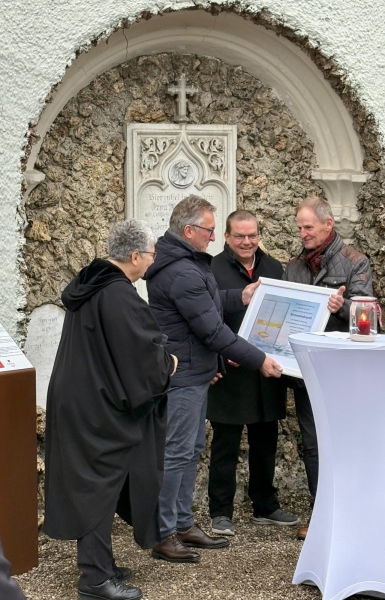 Aus diesem Grund nutzten Barbara Danninger, Norbert Köpferl und Manfred Linner seitens der Kolpingsfamilie Tittmoning die Einweihungsfeier ebenfalls für die Übergabe der Schenkungsurkunde des gestalteten Sternenkindergrabes an Bürgermeistermeister Andreas Bratzdrum als Vertreter der Stadt Tittmoning. Bürgermeister Andreas Bratzdrum erwies der Kolpingsfamilie Tittmoning mit den Worten "Die Menschlichkeit einer Gesellschaft zeige sich, wie sie mit ihren Schwächsten umgeht" seine Dankbarkeit. Insbesondere dankte das Stadtoberhaupt den Projektverantwortlichen Norbert Köpferl für seine Hartnäckigkeit in diesem langjährigen Projekt. Mit dem Sternenkindergrab sei ein "Ort für die Schwächsten der Gesellschaft" entstanden. Denn ein Kind, das früh verloren wurde, bleibe immer im Herzen fest verankert und sei unvergessen für Eltern, Geschwister und Angehörige. Bratzdrum wünschte, dass dieses wunderbare Kunstwerk ein Ort der Stille, Hoffnung und liebevollen Erinnerung sei.