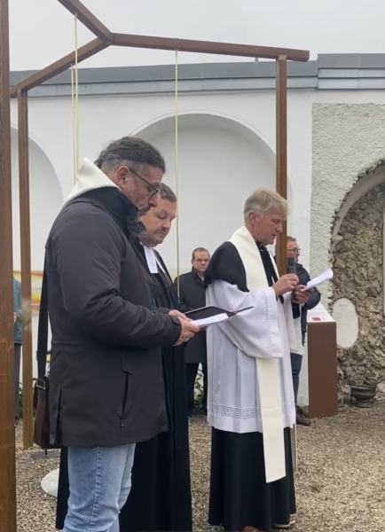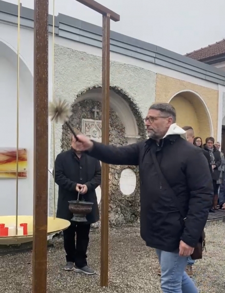 Ebenfalls dankte Norbert Köpferl Bruder Thomas Hessler OSB aus dem Kloster Gut Aich für seine Ausdauer, welcher das Projekt von Anfang an künstlerisch begleitete. Letztgenannter erläuterte in seinem Grußwort das Projekt "Tittmoninger Sternenkindergrab" aus der künstlerischen Perspektive. Insgesamt habe er ein Kunstwerk entworfen, in dem "Aufhebung" deutlich werde. Mit der den Himmel oder die Ewigkeit darstellenden schwebenden Goldschale werde etwas auf eine andere Ebene gehoben. Mit der darunter liegenden Steinplatte werde die Erdverbundenheit symbolisiert.
