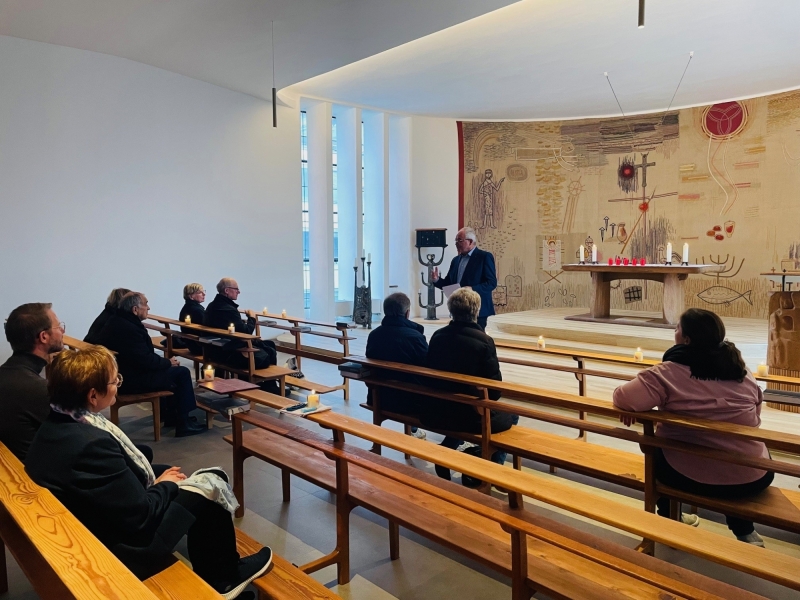 Im Rahmen seines Impulses erläuterte der Präses zudem den kunstvollen Wandteppich der Kapelle, der biblische Motive aufgreift und zentrale Szenen des Kirchenjahres abbildet.