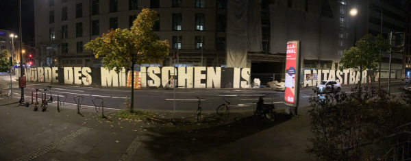 Beim Bundestreffen der Geistlichen Leitungen und Präsides in Frankfurt prangt gegenüber des Kolpinghotels am Bauzaun des Nachbarhauses in großen Buchstaben der Schriftzug: „Die Würde des Menschen ist unantastbar“. An einer Stelle ist der Bauzaun derzeit unterbrochen und macht eine Lücke frei, so dass übrigbleibt: „Die Würde des Menschen is antastbar“.
