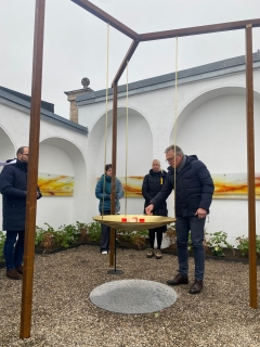 Ebenfalls dankte Norbert Köpferl Bruder Thomas Hessler OSB aus dem Kloster Gut Aich für seine Ausdauer, welcher das Projekt von Anfang an künstlerisch begleitete. Letztgenannter erläuterte in seinem Grußwort das Projekt "Tittmoninger Sternenkindergrab" aus der künstlerischen Perspektive. Insgesamt habe er ein Kunstwerk entworfen, in dem "Aufhebung" deutlich werde. Mit der den Himmel oder die Ewigkeit darstellenden schwebenden Goldschale werde etwas auf eine andere Ebene gehoben. Mit der darunter liegenden Steinplatte werde die Erdverbundenheit symbolisiert.