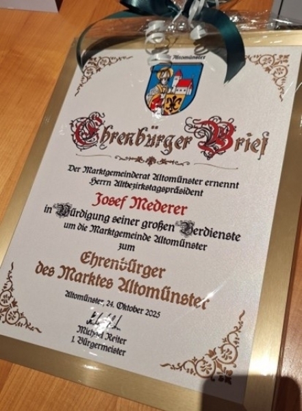 Josef Mederer, stellv. Diözesanvorsitzender, wurde zum Ehrenbürger der Gemeinde Altomünster ernannt