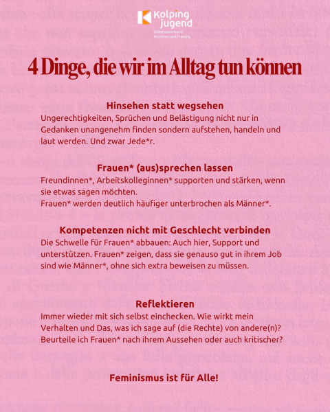 Immer wieder mit sich selbst einchecken. Wie wirkt mein Verhalten und Das, was ich sage auf (die Rechte) von andere(n)? Beurteile ich Frauen* nach ihrem Aussehen oder auch kritischer?