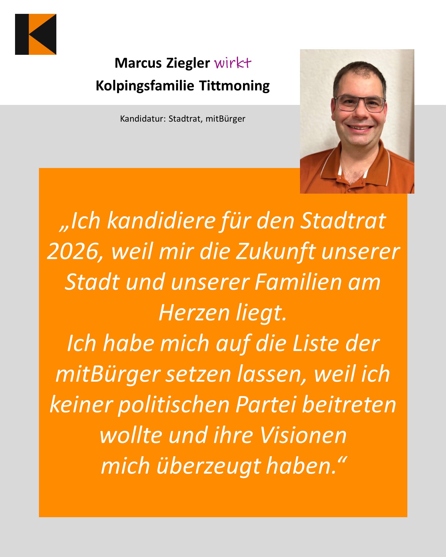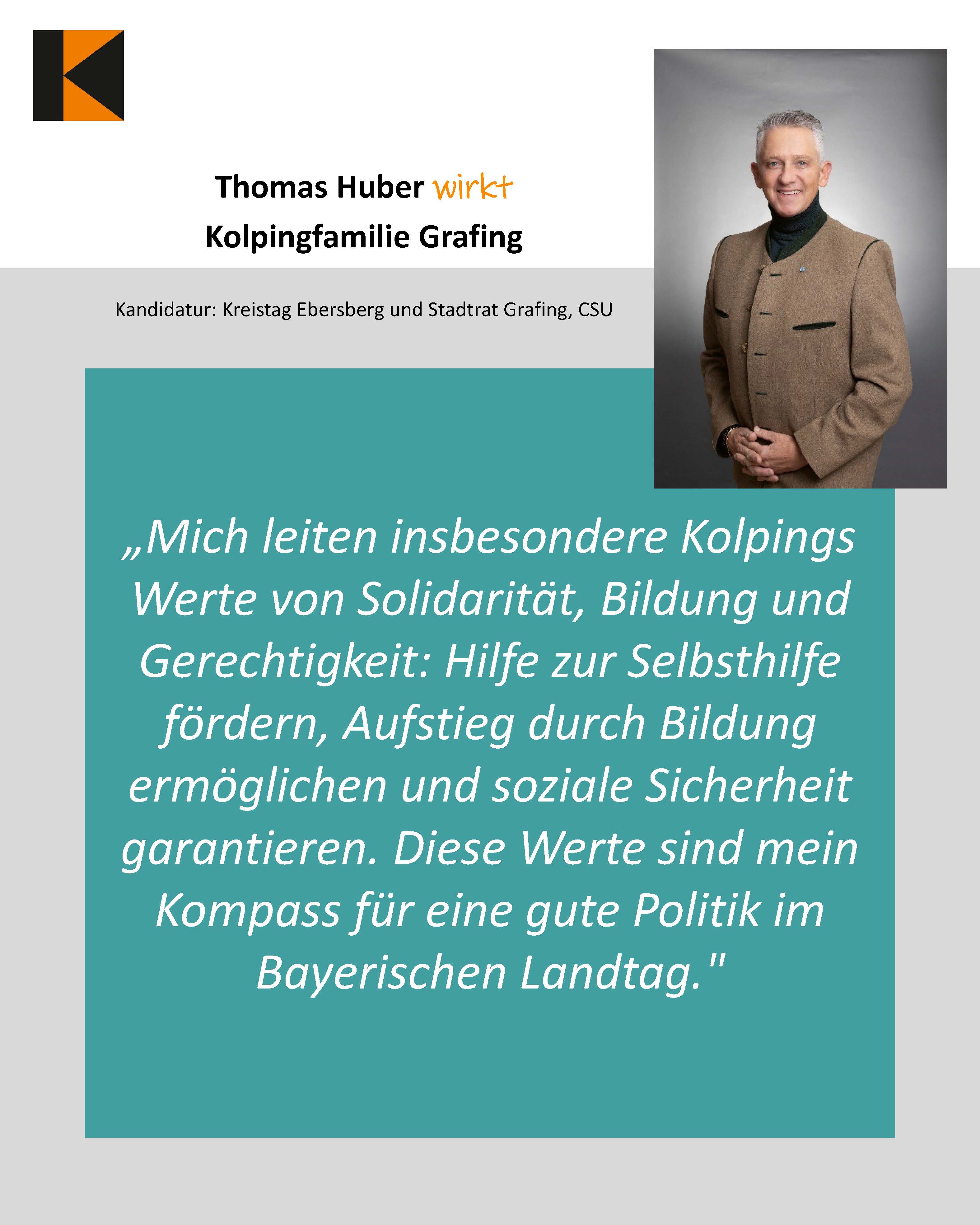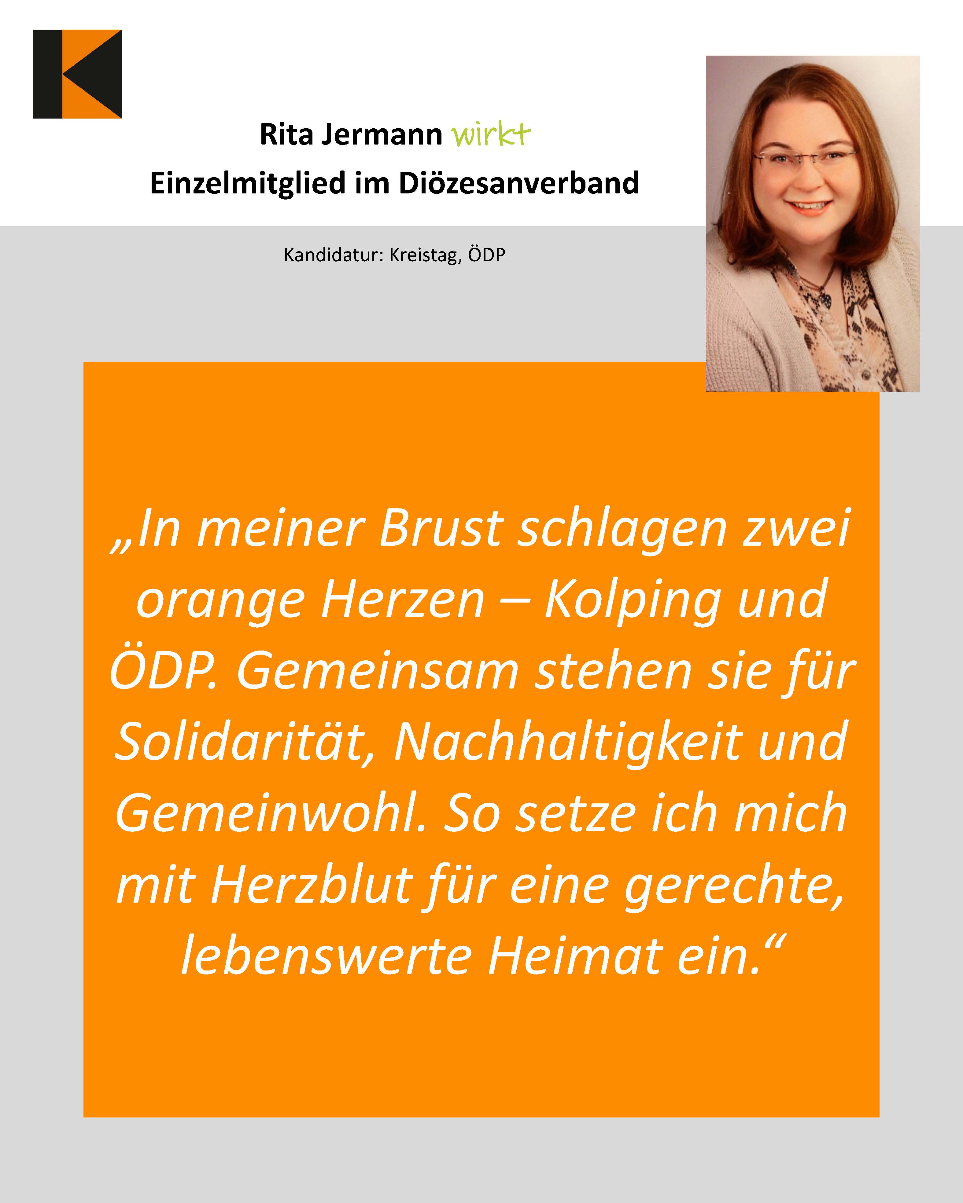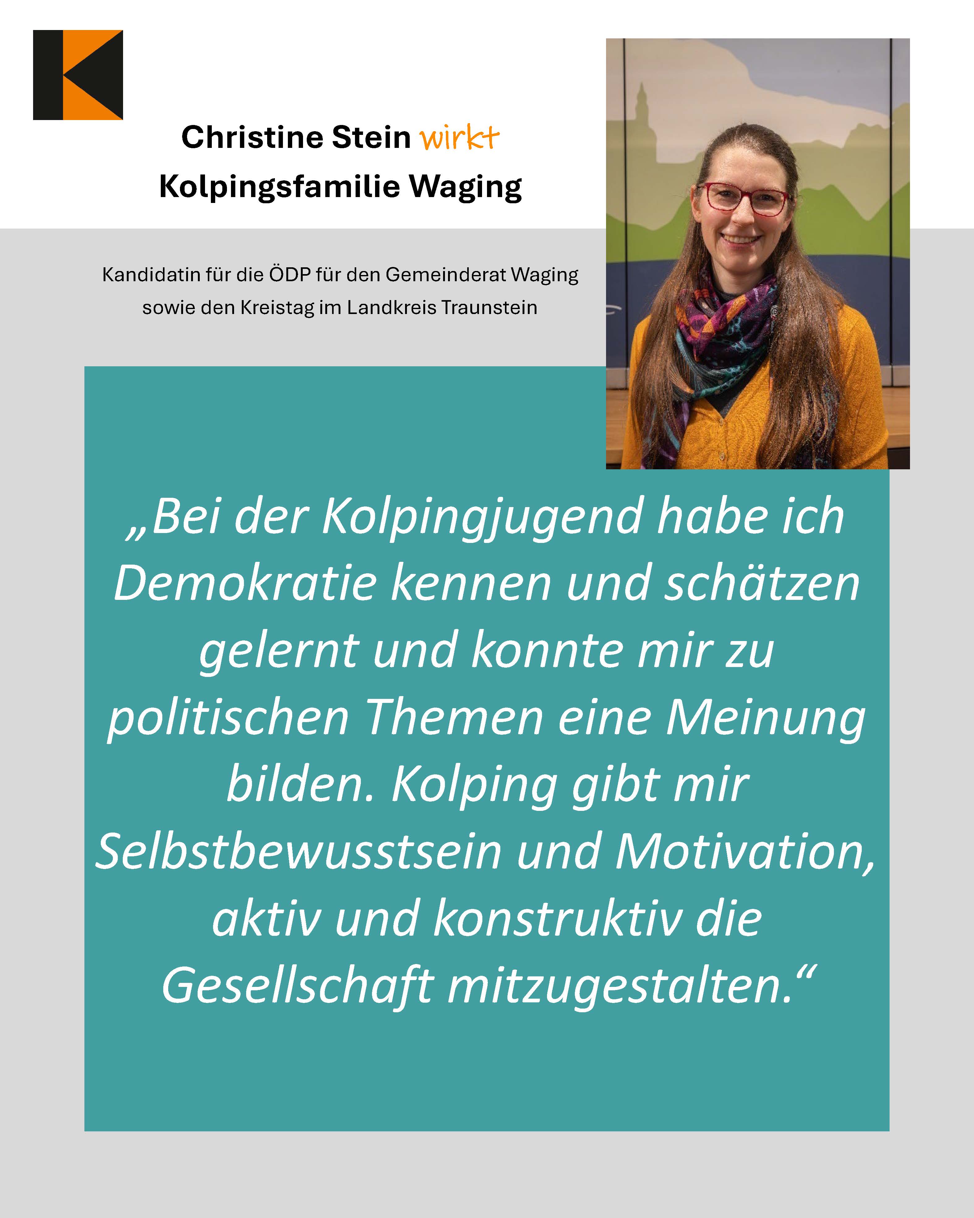 Bei den Kommunalwahlen 2026 in Bayern kandidieren viele Kolpingmitglieder für Stadt- und Gemeinderäte oder als Bürgermeister*innen. Mit der Aktion soll sichtbar werden, dass christlich-soziale Werte wie Solidarität und Gemeinschaft unser Handeln prägen – auch in der Politik. Mit persönlichen Porträts wird diesem Einsatz ein Gesicht gegeben und deutlich gemacht: Aus der Kolpinggemeinschaft erwächst Mut zur Mitgestaltung. Gemeinsam tragen wir Verantwortung und gestalten unsere Städte und Gemeinden aktiv mit.