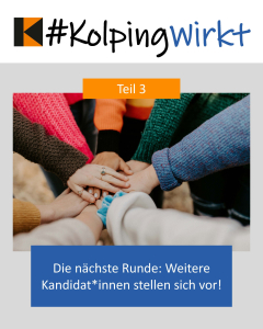 Wichtig ist zu erwähnen, dass es uns nicht um Parteipolitik geht. Wir bevorzugen keine bestimmte demokratische Partei, sondern präsentieren die Bandbreite unseres Kolpingengagements und vor allem die Kolpinggeschwister, die diesem Engagement ein Gesicht geben – auch wenn sie womöglich nicht in das angestrebte Amt gewählt werden. Auch das ist Demokratie, dass trotz einer Niederlage das gesellschaftliche Wirken weitergeht.