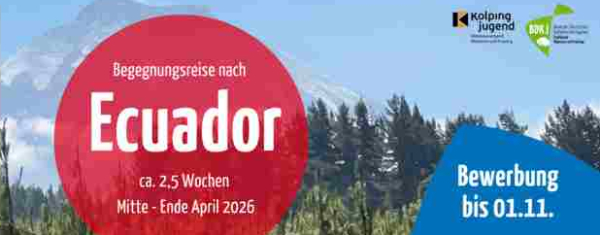 Der BDKJ München und Freising lädt in Kooperation mit der Kolpingjugend im April 2026 zu einer unvergesslichen Fahrt nach Ecuador ein. Wir werden die Jugendarbeit vor Ort und auf nationaler Ebene kennenlernen, soziale Einrichtungen besuchen und uns mit verschiedenen Jugendgruppen treffen. Gemeinsam verbringen wir Zeit, unternehmen Ausflüge und tauschen uns über unser Leben, unseren Glauben und unsere Kulturen aus.
